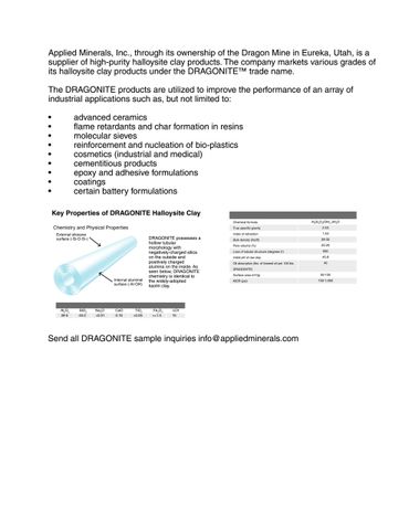 Applied Minerals is a leading global producer of Halloysite Clay. Vertically integrated from Mine to Market, our niche focus and in-depth application knowledge allow us to offer our customers commercially consistent product grades, specifically tailored to achieve enhanced performance objectives. Applied MInerals is the owner of the Dragon Mine, the only known measured resource of Halloysite Clay in the western hemisphere significant enough for large scale commercial production. The Dragon Mine is located in the Tintic District of Utah stretching over 230 acres of land. Applied Minerals retained the world’s leading experts in Halloysite to create a standard for the characterization, quantification, and commercialization of this unique mineral. As a result of these efforts, the Company is able to deliver commercially consistent product grades of the highest quality Halloysite in the world